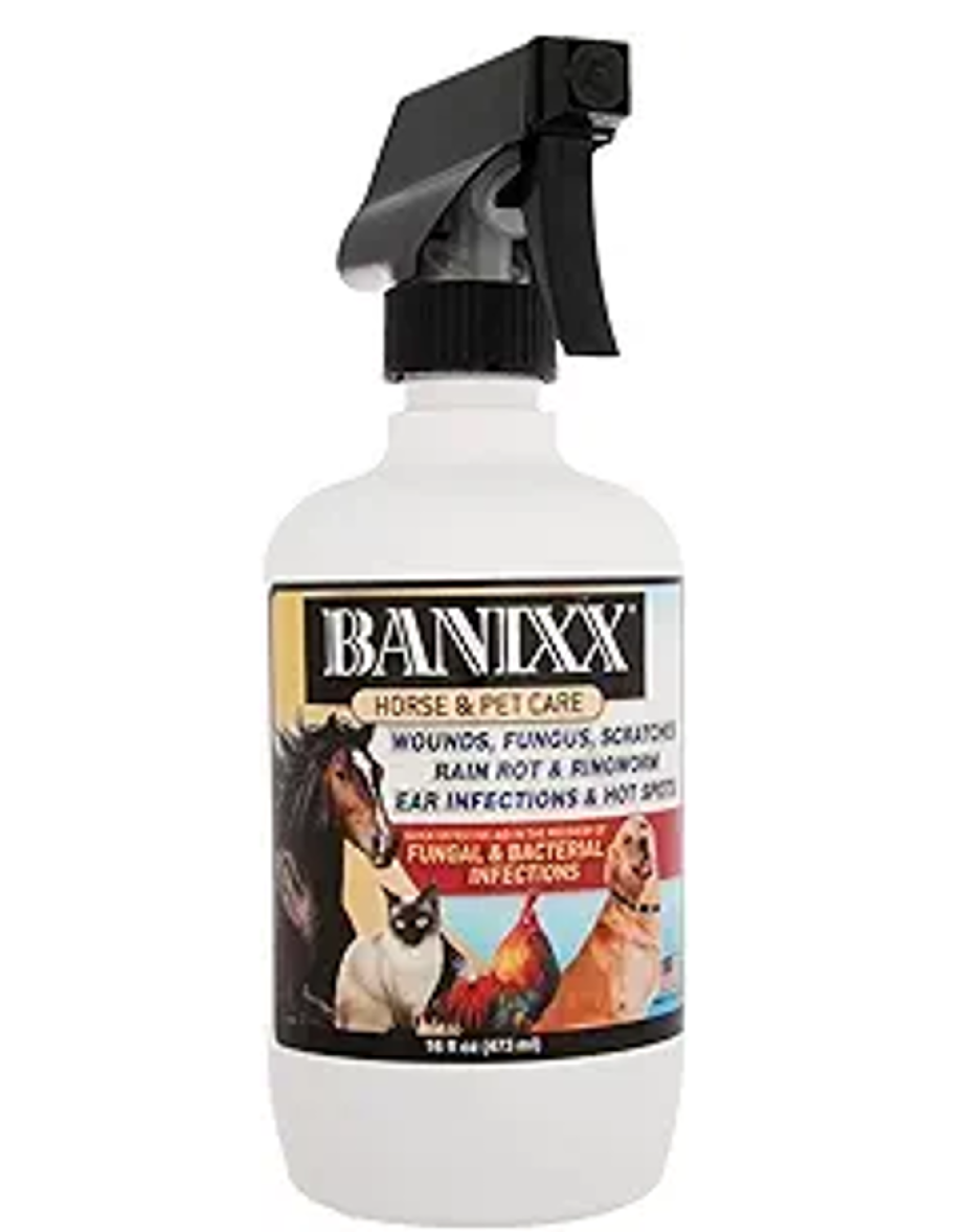 Banixx Horse & Pet Care 16 oz. is an effective anti-bacterial, anti-fungal, steroid-free spray solution for skin wounds/infections and foot infections. Easy to use, it has no smell, does not sting, and contains no colorants, so it does not stain. Use for all size wounds and skin problems such as rain-rot, ring-worm, scratches etc. Potent against the bacteria involved with white-line, thrush, and abscesses. Environmentally friendly!