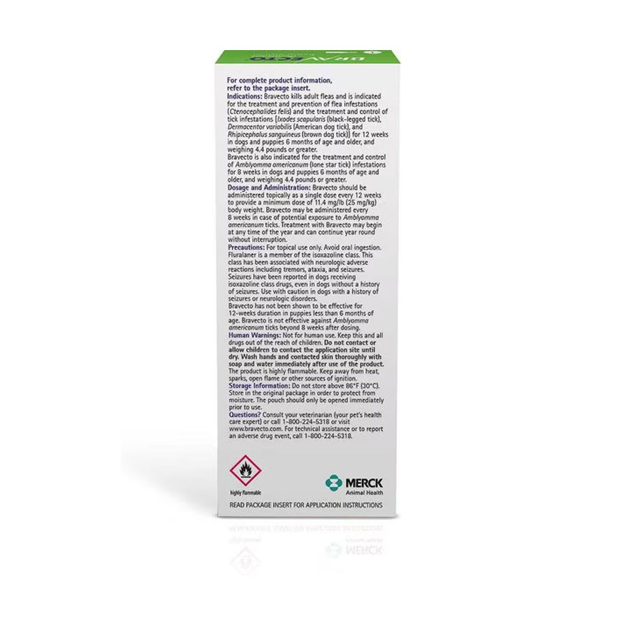 BRAVECTO (fluralaner topical solution) for Dogs provides up to 12 weeks of powerful flea and tick protection in just one dose. Vet-recommended and FDA-approved, BRAVECTO starts killing fleas and ticks within hours, prevents flea infestations, kills ticks (black-legged tick, American dog tick and brown dog tick) for 12 weeksand kills lone star ticks for 8 weeks.IMPORTANT SAFETY INFORMATION:BRAVECTO (fluralaner topical solution) for Dogs: The most commonly reported adverse reactions include vomiting, hair loss, diarrhea, lethargy, decreased appetite, and moist dermatitis/rash. BRAVECTO Topical Solution for Dogs has not been shown to be effective for 12-weeks’ duration in puppies less than 6 months of age. BRAVECTO Topical Solution for Dogs is not effective against lone star ticks beyond 8 weeks of dosing. For topical use only. Avoid oral ingestion. Fluralaner is a member of the isoxazoline class. This class has been associated with neurologic adverse reactions including tremors, ataxia, and seizures. Seizures have been reported in dogs receiving isoxazoline class drugs, even in dogs without a history of seizures. Use with caution in dogs with a history of seizures or neurologic disorders.