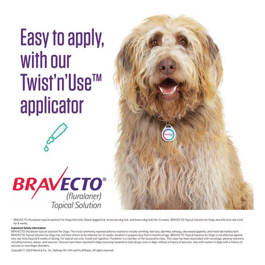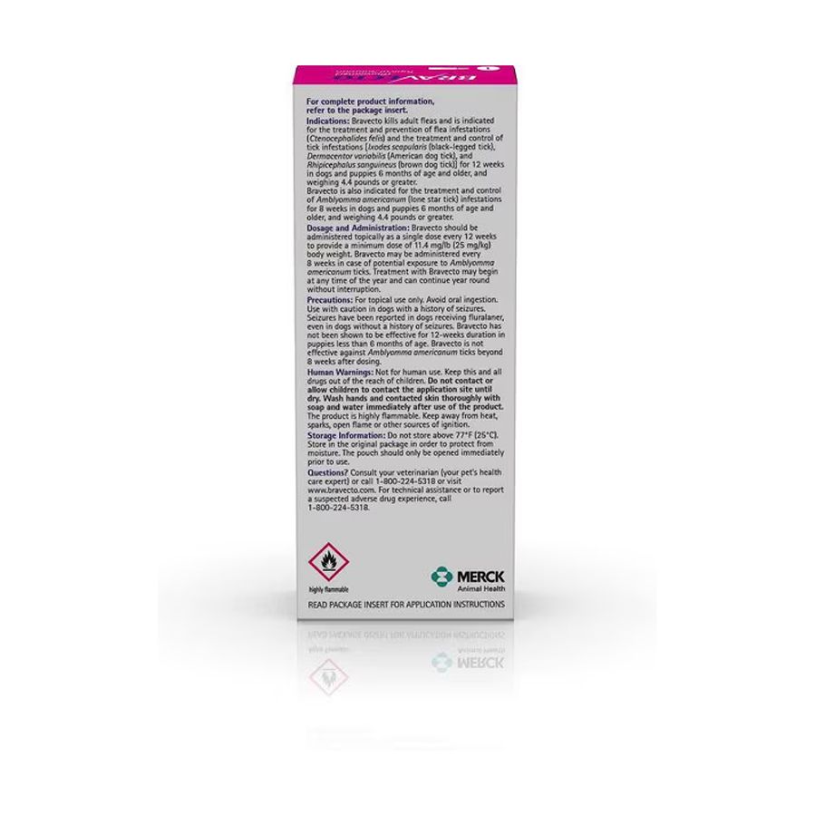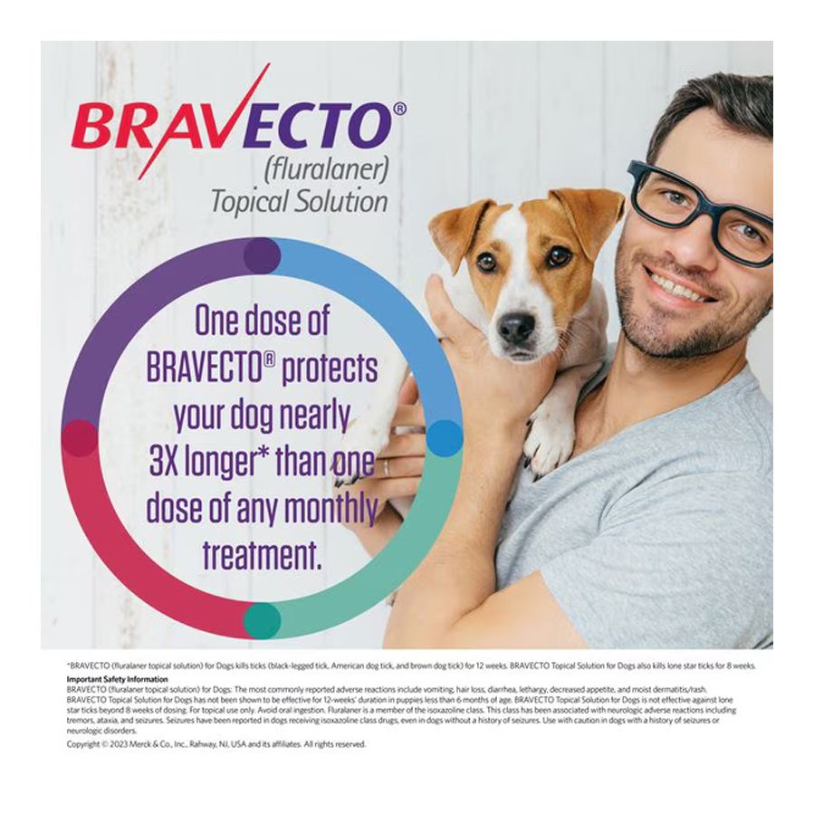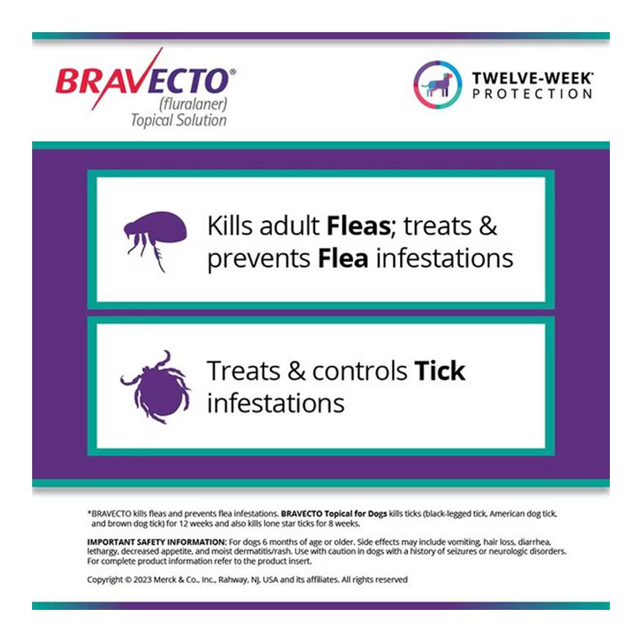 BRAVECTO (fluralaner topical solution) for Dogs provides up to 12 weeks of powerful flea and tick protection in just one dose. Vet-recommended and FDA-approved, BRAVECTO starts killing fleas and ticks within hours, prevents flea infestations, kills ticks (black-legged tick, American dog tick and brown dog tick) for 12 weeksand kills lone star ticks for 8 weeks.IMPORTANT SAFETY INFORMATION:BRAVECTO (fluralaner topical solution) for Dogs: The most commonly reported adverse reactions include vomiting, hair loss, diarrhea, lethargy, decreased appetite, and moist dermatitis/rash. BRAVECTO Topical Solution for Dogs has not been shown to be effective for 12-weeks’ duration in puppies less than 6 months of age. BRAVECTO Topical Solution for Dogs is not effective against lone star ticks beyond 8 weeks of dosing. For topical use only. Avoid oral ingestion. Fluralaner is a member of the isoxazoline class. This class has been associated with neurologic adverse reactions including tremors, ataxia, and seizures. Seizures have been reported in dogs receiving isoxazoline class drugs, even in dogs without a history of seizures. Use with caution in dogs with a history of seizures or neurologic disorders.
