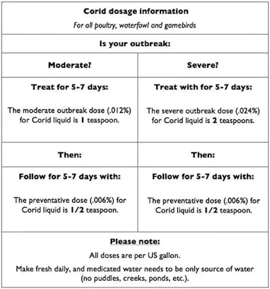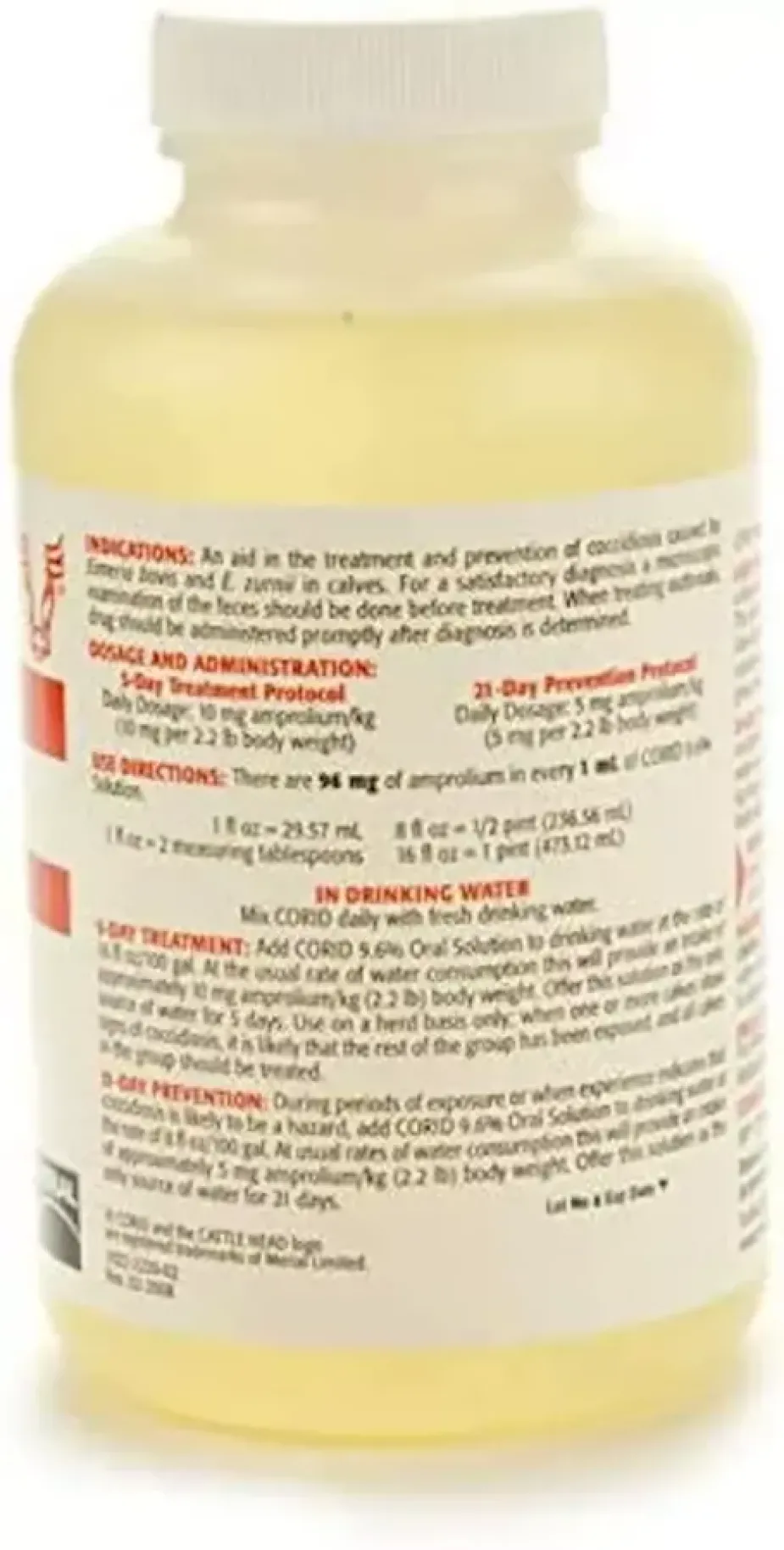 Corid 9.6% Oral Solution Coccidiostat (Amprolium) for use as an aid in the prevention and treatment of coccidiosis in calves. Can be used as either a drench or in the drinking water. Treatment: 16 oz. to 100 gallon water for 5 days. Prevention: 8 oz. to 100 gallon water for 21 days.