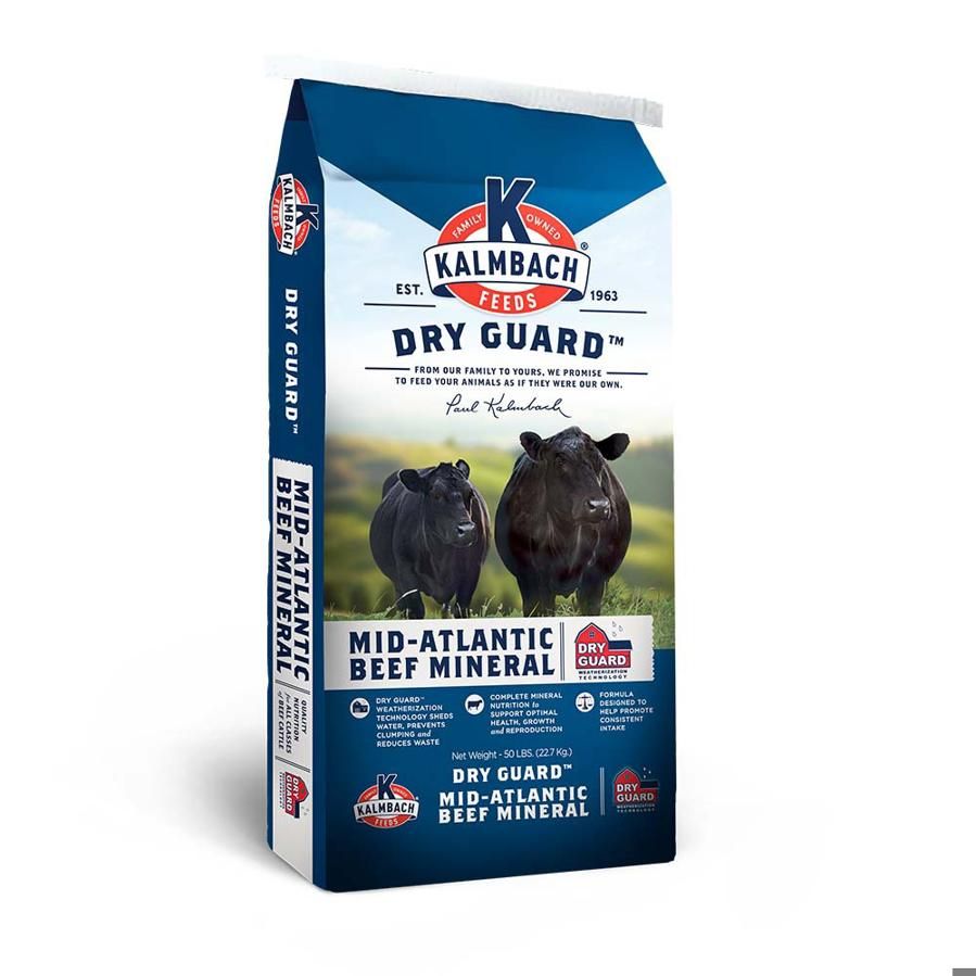 Kalmbach Mid-Atlantic Hi-Mag Mineral. A high magnesium mineral blend for beef cattle on pasture. 12% magnesium helps prevent grass tetany. Complete and balanced mineral nutrition. Dry Guard® weatherization technology sheds water, prevents clumping and reduces waste. Meal 50lb Bag