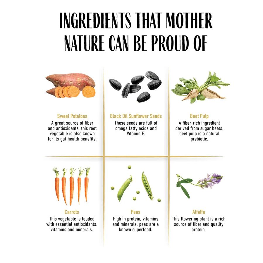 Canola Meal, Linseed Meal, Dehydrated Alfalfa Meal, Flaxseed Meal, Ground Beet Pulp, Dehydrated Carrots, Dehydrated Sweet Potatoes, Green Split Peas, Canola Oil, Cane Molasses, Recleaned Whole Oats, Black Oil Sunflower Seeds, Dried Whey, Monocalcium Phosphate, Calcium Carbonate, Salt, Active Dry Yeast,