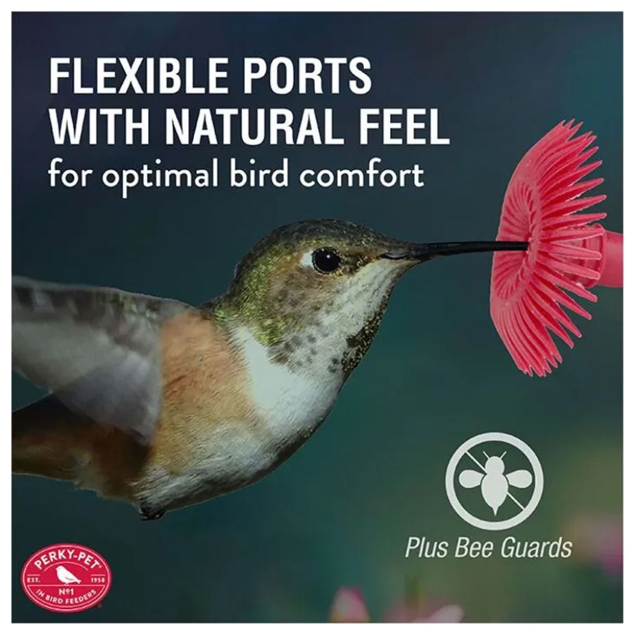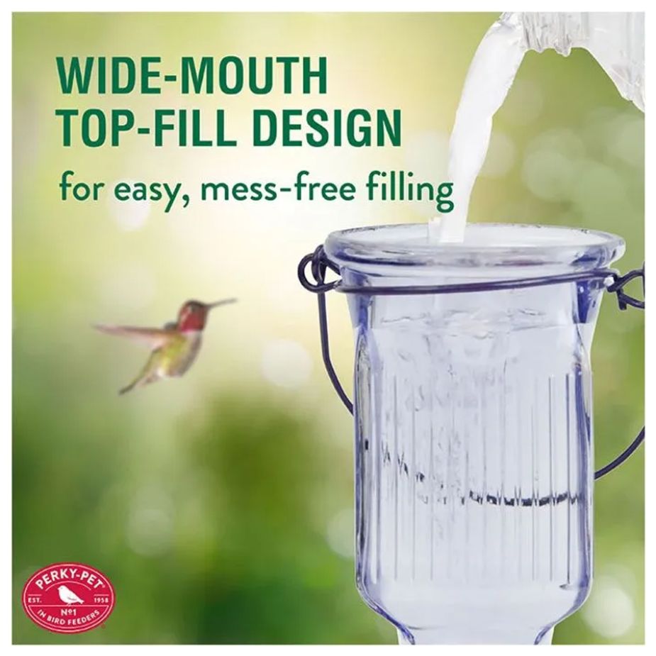 Presenting the patented Top-Fill bottle you love with a show stopping new color and glass design, the Perky-Pet® Lavender Field Top-Fill Glass Hummingbird Feeder is a favorite of birders and hummingbirds alike. The wide-mouth opening and Top-Fill design ensure that filling is always easy and mess-free! While you enjoy time saved from filling and cleaning, your hummingbirds won’t be able to resist the feeder’s lifelike zinnia-inspired flowers. They are bright, soft and flexible just like the flowers they flock to in nature! The flowers’ long stem design also acts as a natural bee guard to keep bugs out. Find the best seat in your house now, because hummingbirds are sure to be on their way!