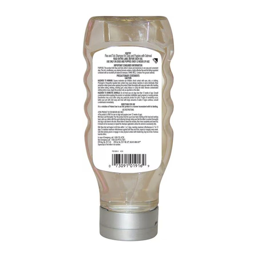 Wet dog’s coat thoroughly. Pour Sentry Flea & Tick Shampoo for dogs and puppies with oatmeal into the cup of your hand. Starting at the head and working back, work up a lather with this quick lathering formula, being sure that the lather is worked thoroughly into the dog’s coat down to the skin. Allow lather to stand five minutes, then rinse completely and towel dry. It should not be necessary to repeat the shampoo application unless the animal is excessively dirty. Kills fleas fast and begins to kill ticks within 1 to 2 days; reaching maximum effectiveness in 7 to 10 days. To maintain maximum effectiveness against both flea and ticks, repeat every week. Cats that actively groom or engage in close physical contact with treated dog may be at risk of serious harmful effect.