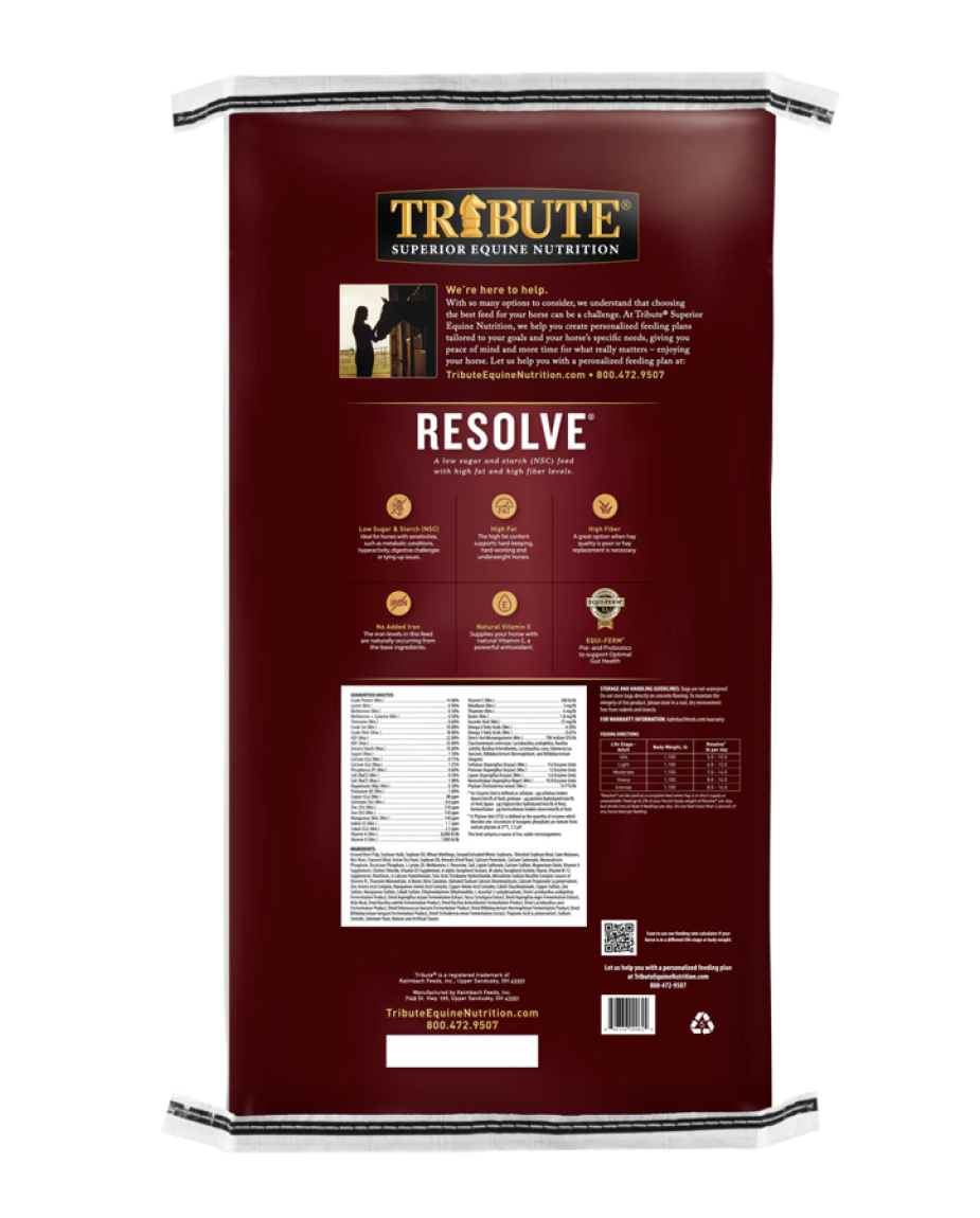 Resolve® was designed with the hard-keeping and hard-working horse in mind. This soft, pelleted feed is high in fat (10%), high in fiber (18%), and low in NSC (17.5%), making it suitable for horses with sugar and starch sensitivities that also have higher calorie needs. Its high fiber level makes it a great option when hay quality is poor or hay replacement is necessary. Resolve® is also formulated with higher levels of Vitamin E (300 IU/lb), as well as pre- and probiotics to support your horse’s digestive health. It does not contain any added iron.