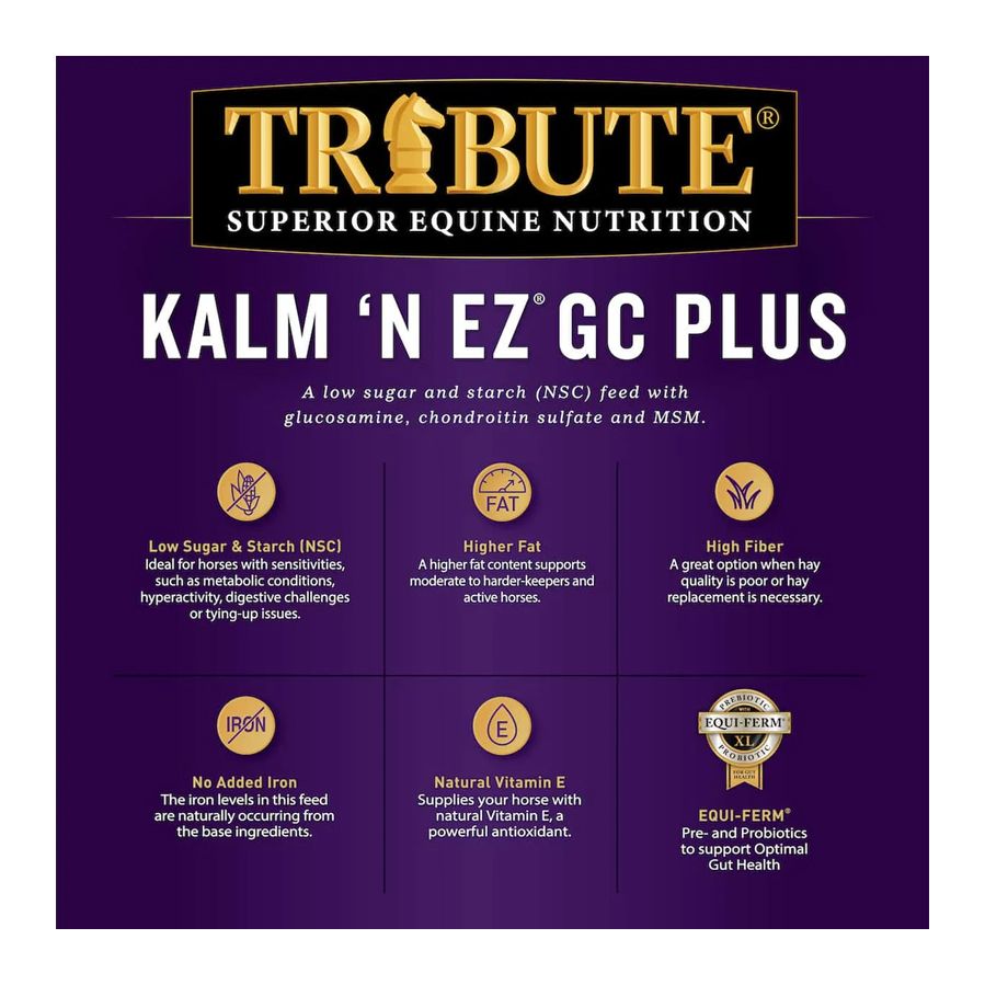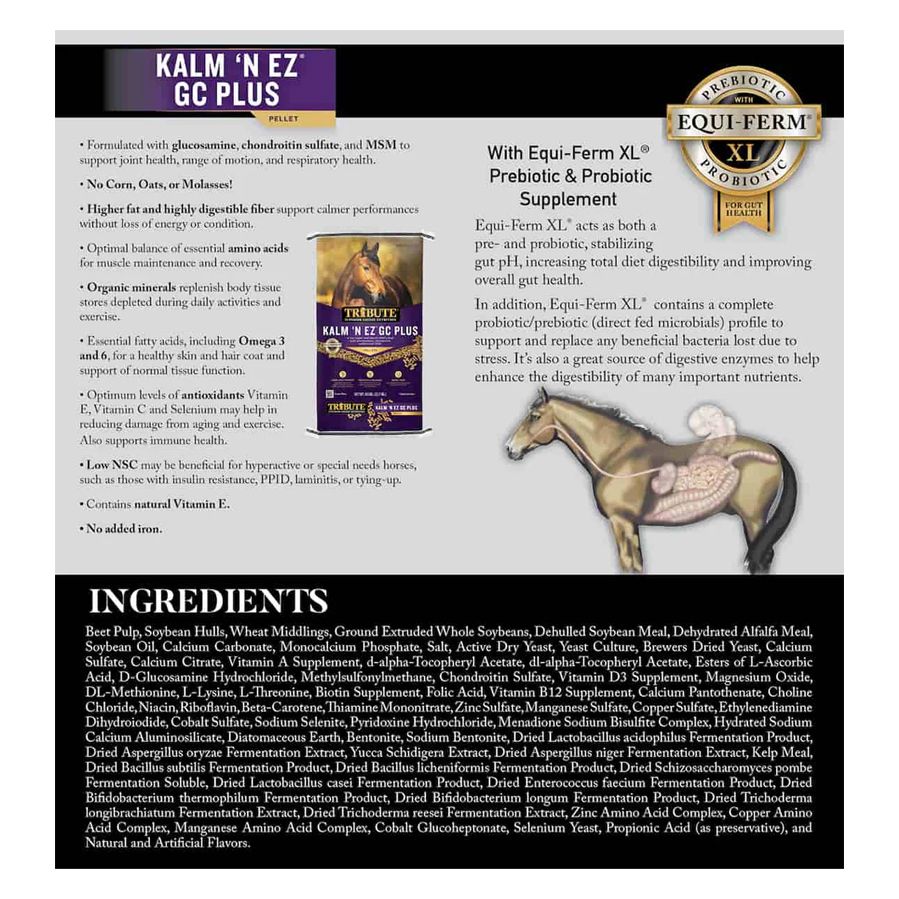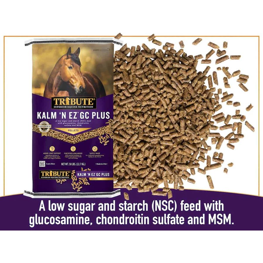 Kalm ‘N EZ® GC Plus is higher in fat (8%), high in fiber (20%), very low in NSC (13.5%) and does not have any added iron. This pelleted feed contains added glucosamine, chondroitin sulfate and MSM to support your horse’s joints. It is suitable for moderate to harder-keeping horses with sugar and starch sensitivities, including Insulin Resistance, PSSM Type 1 and other metabolic disorders. The low sugar and starch (NSC) levels also make it an excellent choice for hyperactive horses and horses with digestive tract sensitivities. Its high fiber level also makes Kalm ‘N EZ® GC Plus a great option when hay quality is poor or hay replacement is necessary. This feed is formulated with pre- and probiotics to support your horse’s digestive health.