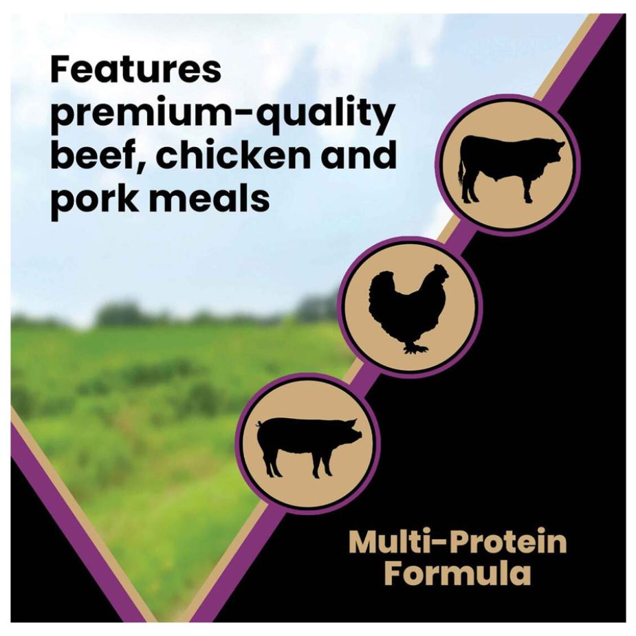 - This nutrient-dense recipe made with premium-quality beef, chicken, and pork meals to provide sustained energy