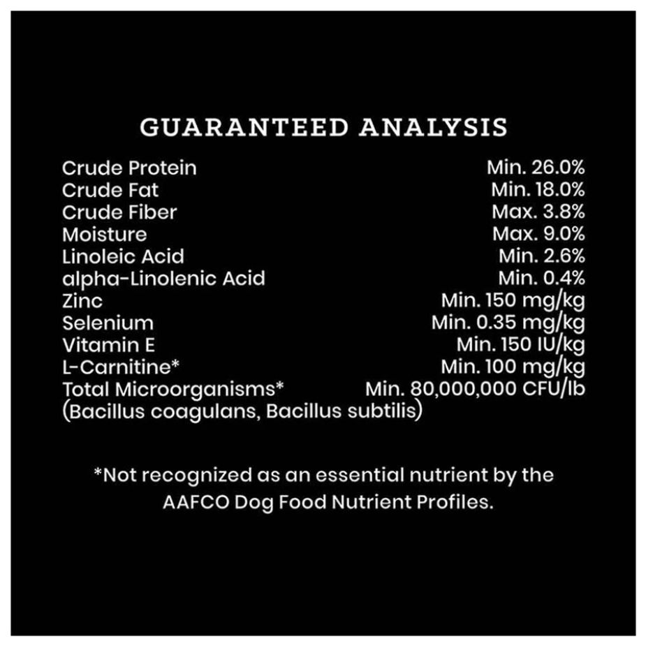 Crude Protein (Min): 28.0%; Crude Fat (Min): 22.0%; Crude Fiber (Max): 4.0%; Moisture (Max): 9.0%; Linoleic Acid (Omega 6) (Min): 3.0%; Phosphorus (Min): 1.15%; Zinc (Min): 160 mg/kg; Selenium (Min): 0.55%; Vitamin E (Min): 175 IU/kg; LCarnitine* (Min): 100 mg/kg; Glucosamine* (Min): 800 mg/kg; Chondroitin* (Min): 300 mg/kg; * Not Recognized as an essential nutrient by AAFCO Nutritional Profile for Dogs.